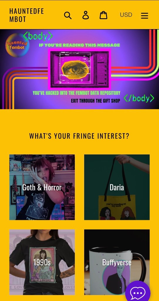Fembot’s website, blog, ads, and social profiles take all of this into account, employing bright color palettes reminiscent of 1980s/90s media and toy packaging, retro fonts that remind customers of old television show title cards & book covers, and clear but playful, sometimes satirical language that is tonally familiar to shows like Daria or Buffy The Vampire Slayer.